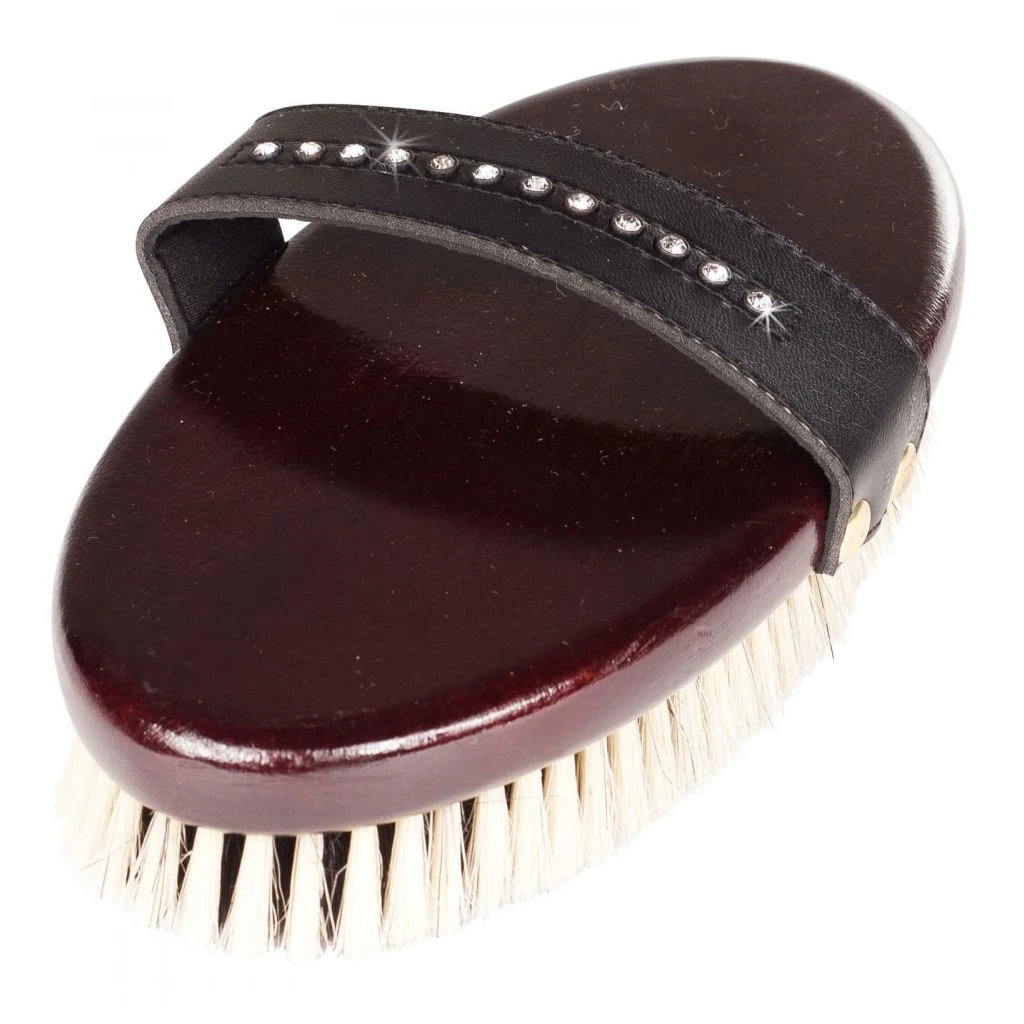 This brush features naturally soft boar hair bristles in an elegant lacquered wooden base. Luxurious soft boar hair pampers your horse with a gentle but thorough grooming. Kind and forgiving on the skin, boar hair will softly remove loose hair, dust, and dander without irritating your horse. A versatile brush that is useful for any sensitive part of the horse. A reinforced hand loop secured with brass rivets and a hand strap primped with crystals adds a completely new experience to grooming. Horze crystals are attached with an industrial puncher to bind with the strap for the strongest hold. The prongs will not hurt the top of your hand while grooming with an added layer of comfort under the hand strap. This brush fits comfortably in your hand for easy grooming. Size 8.6 inches (220 mm) x 4.3 inches (110 mm).